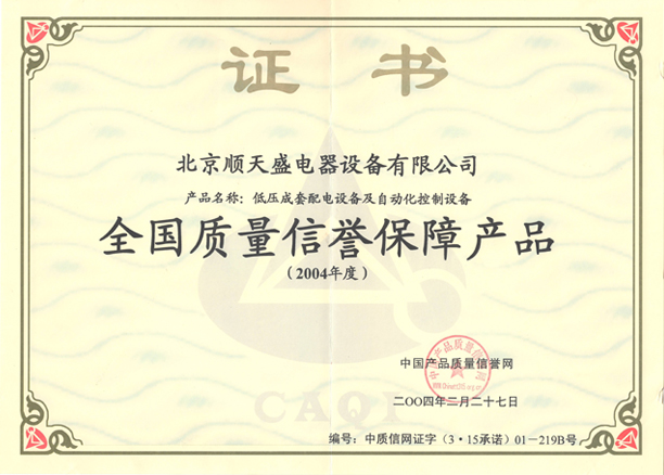全國質(zhì)量信譽(yù)保障產(chǎn)品證書(2004)
